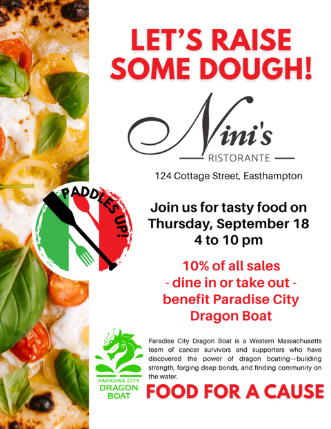 On Thursday, September 18, 4:00-10:00 PM, Nini’s will donate 10% of all dine-in and take-out food and drink sales to Paradise City Dragon Boat!